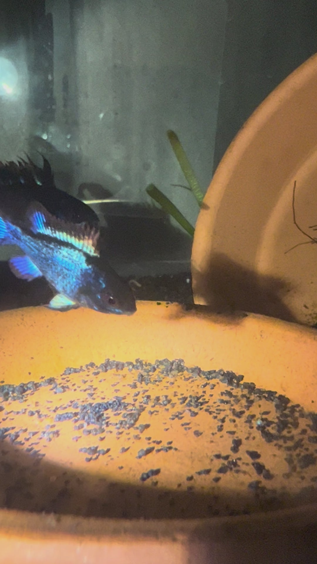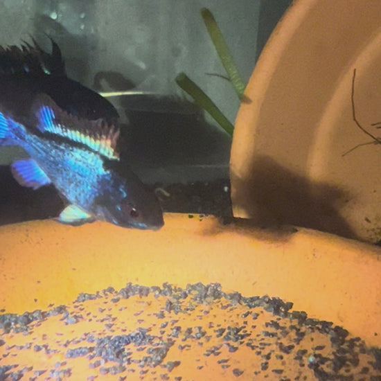 Black Rams thrive in warm, soft, slightly acidic water and prefer a well-planted aquarium with hiding spots and gentle water flow. They are generally peaceful and can be kept with other non-aggressive tank mates. With proper care, they display bright coloration, social behaviors, and even pair bonding during breeding.